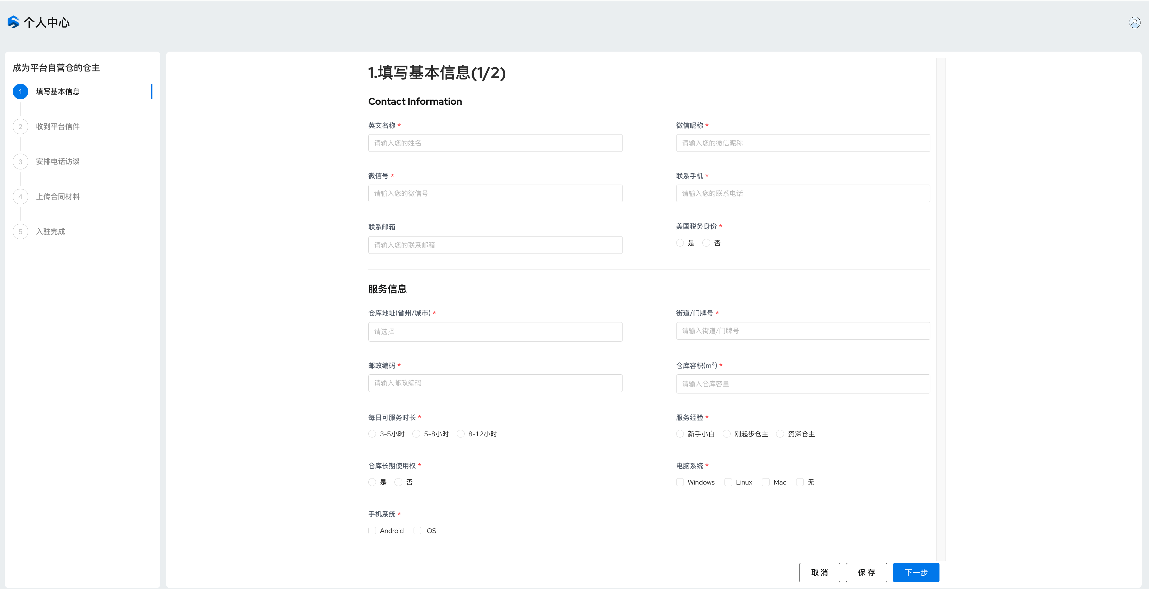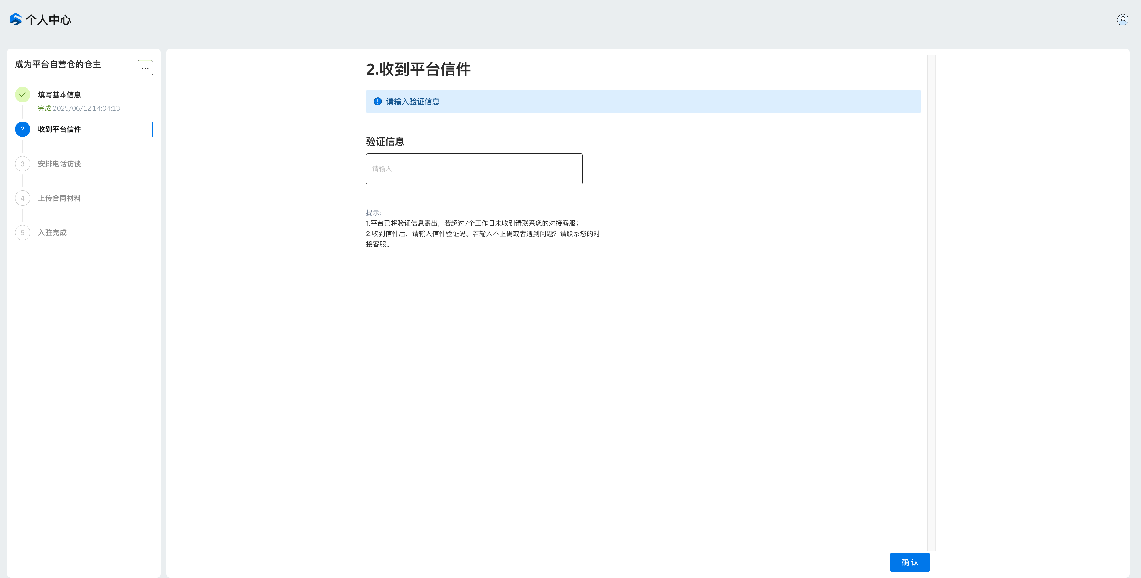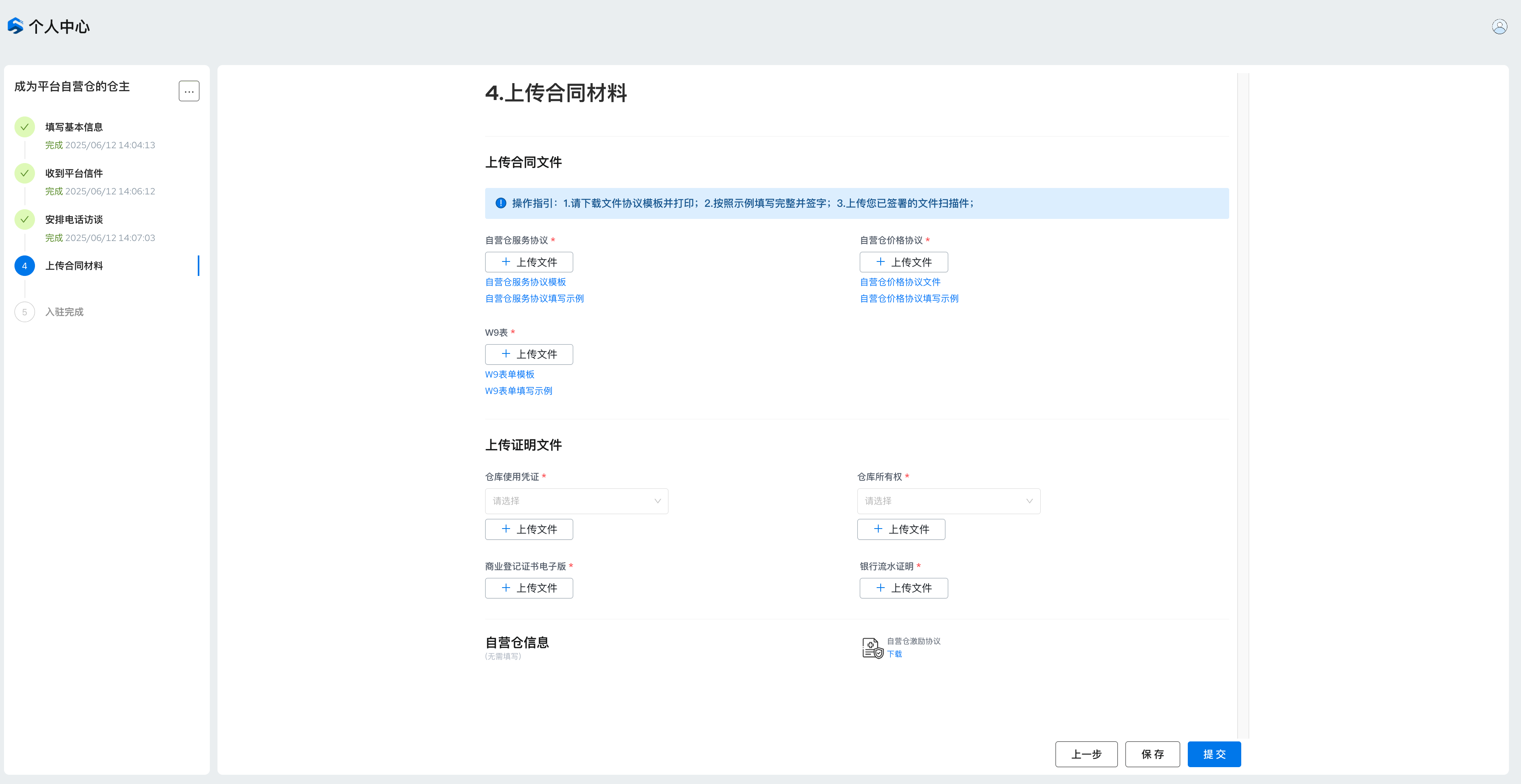 根据自营仓入驻页面信息内容,正确填写相应必填项并提交等待审核;