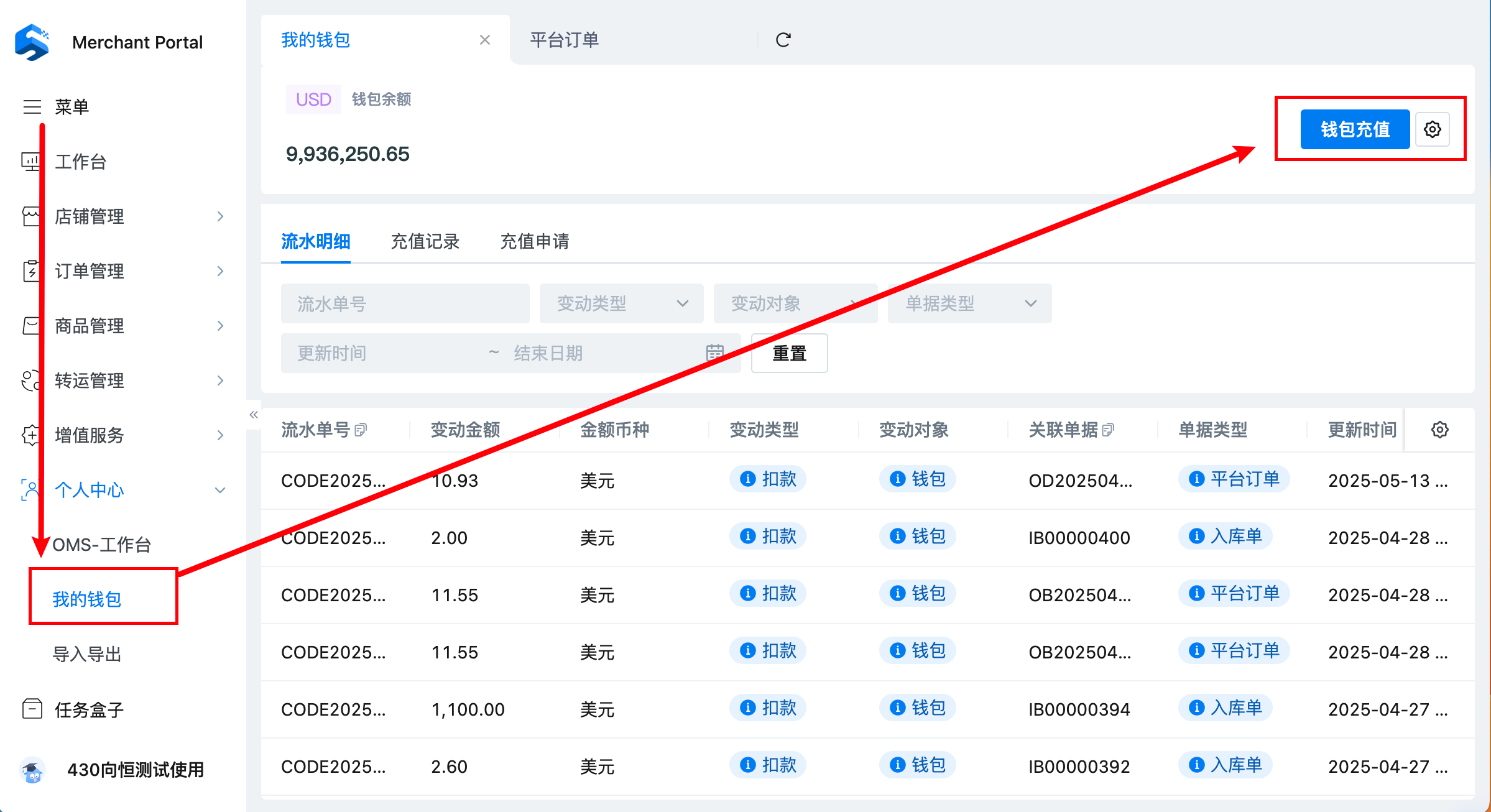 - 钱包余额变更:打开「个人中心」--> 「我的钱包」,点击「钱包充值」。