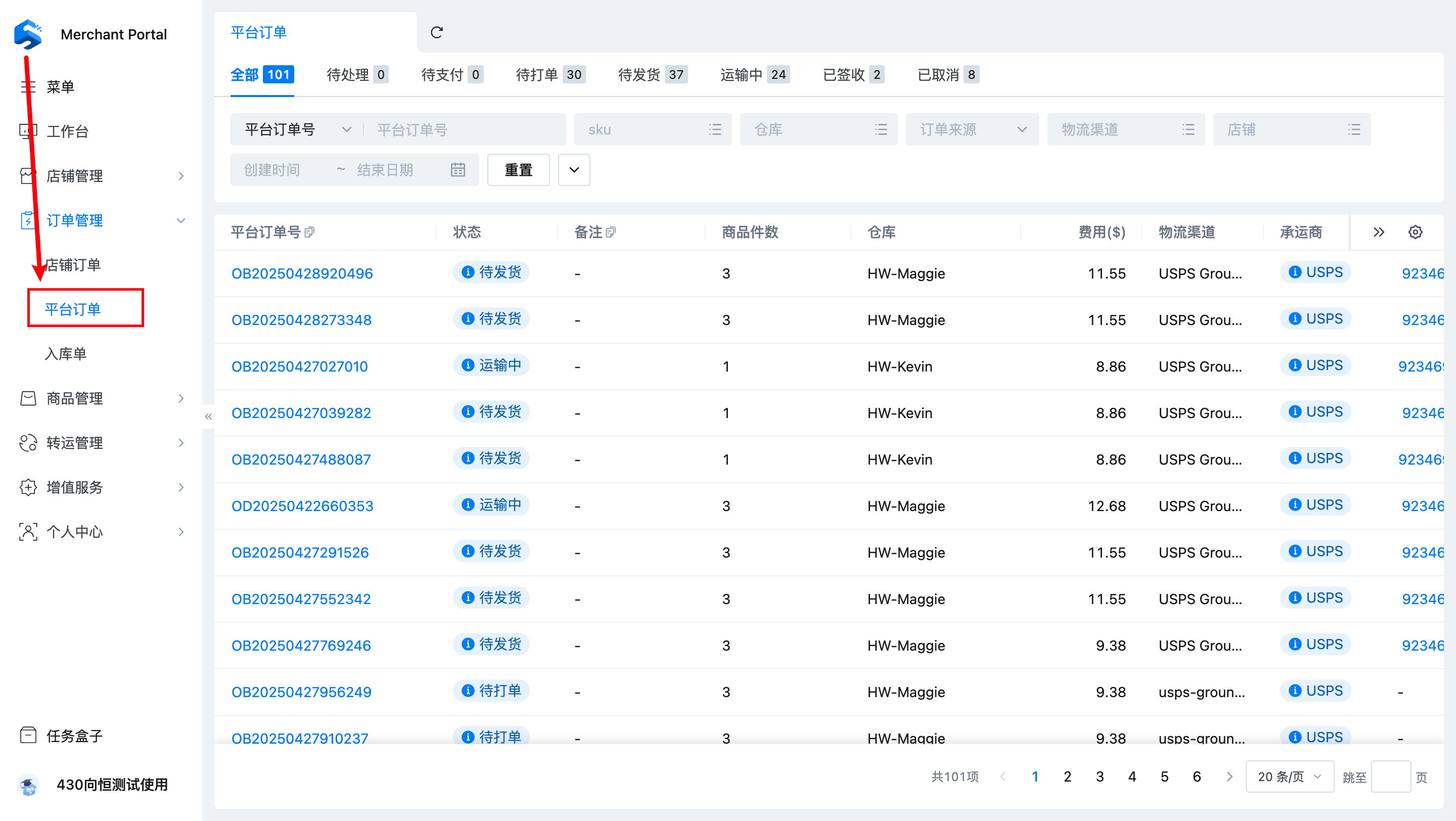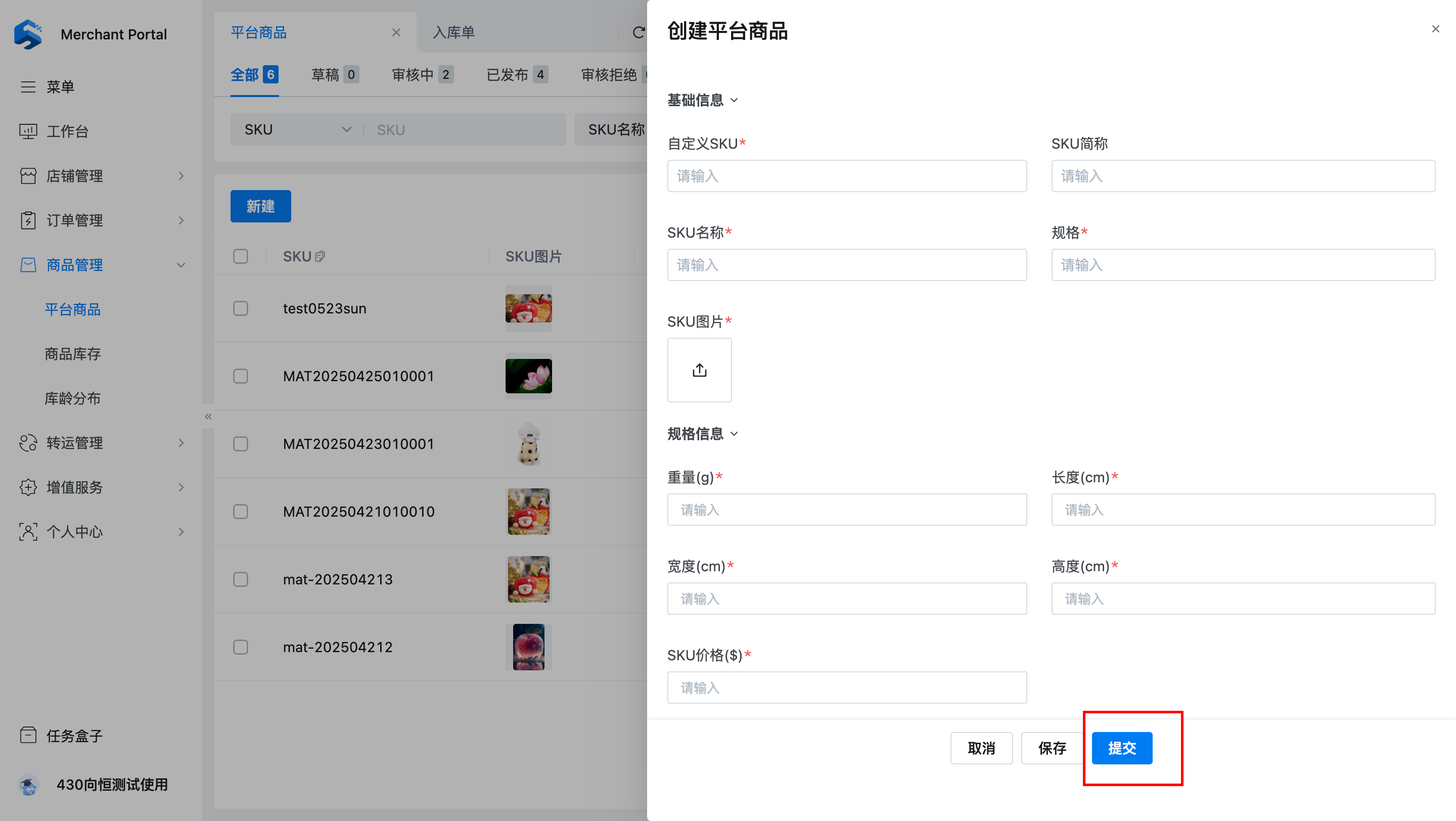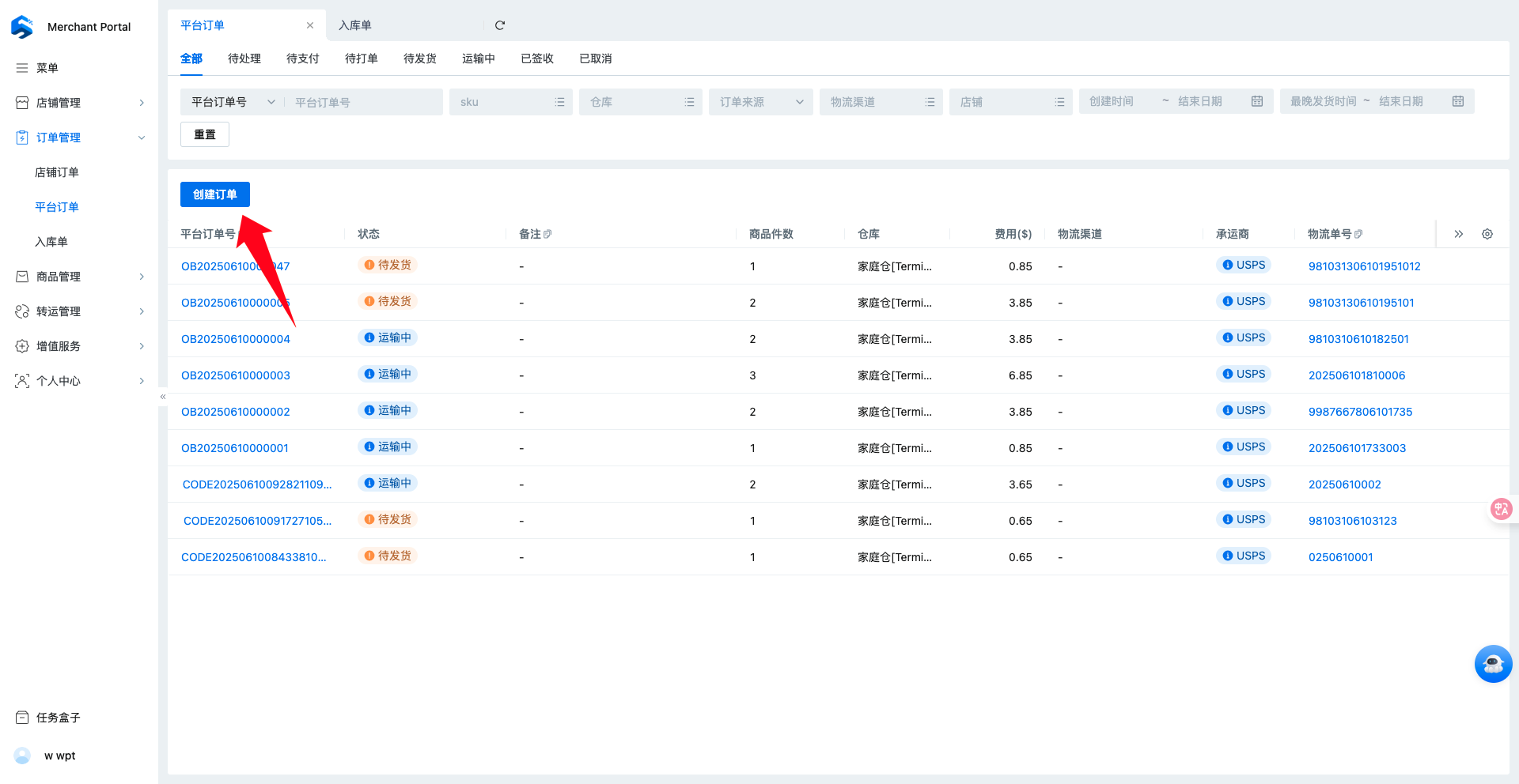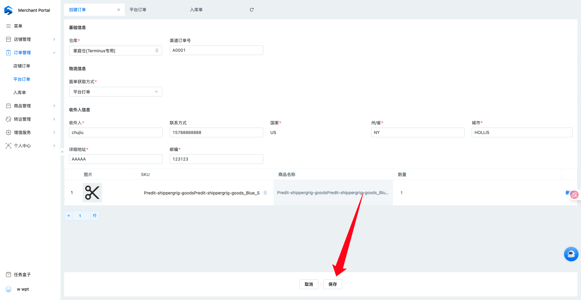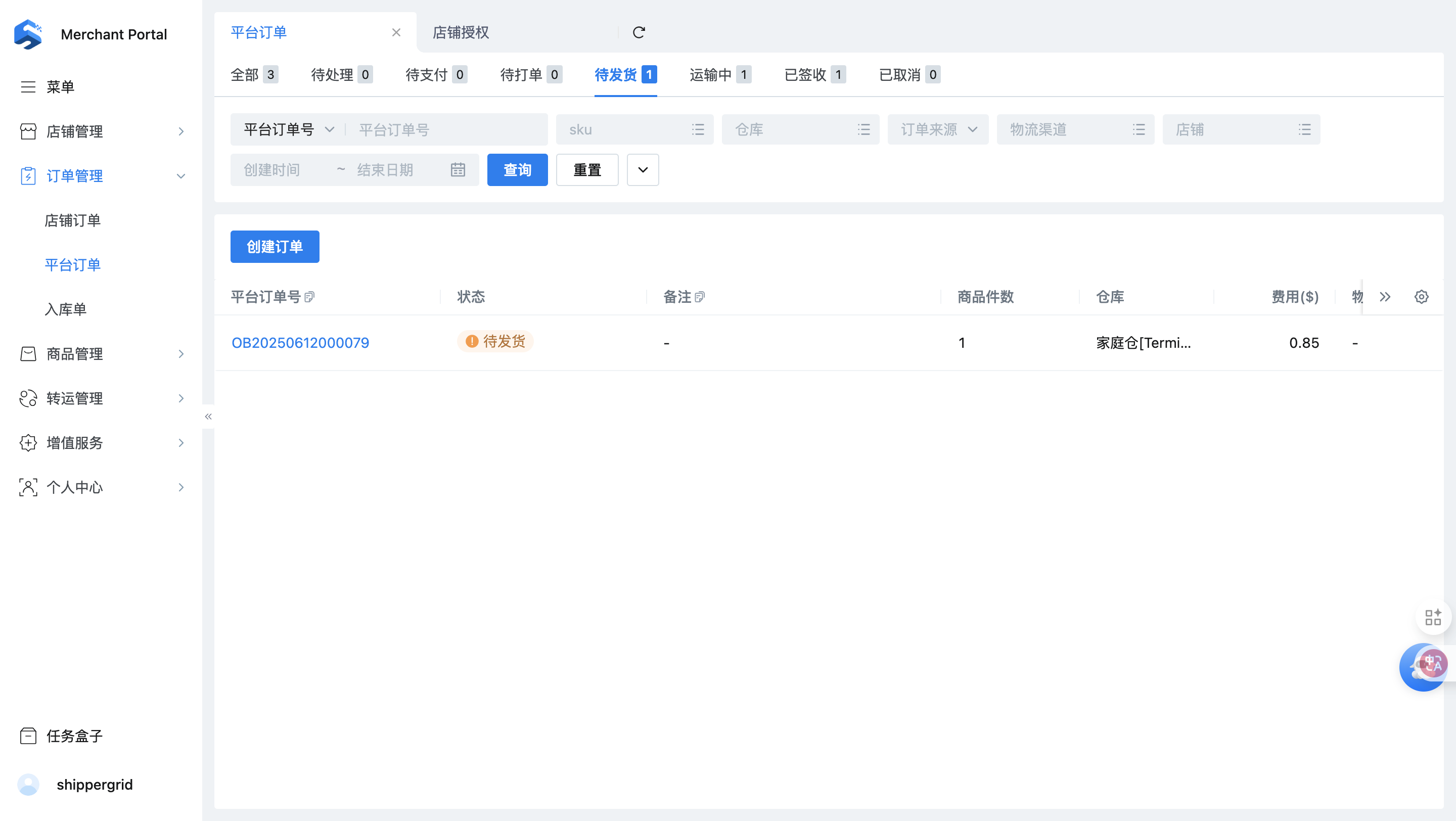 输入发货仓、收件人地址、发货商品后点击提交即可创建平台订单