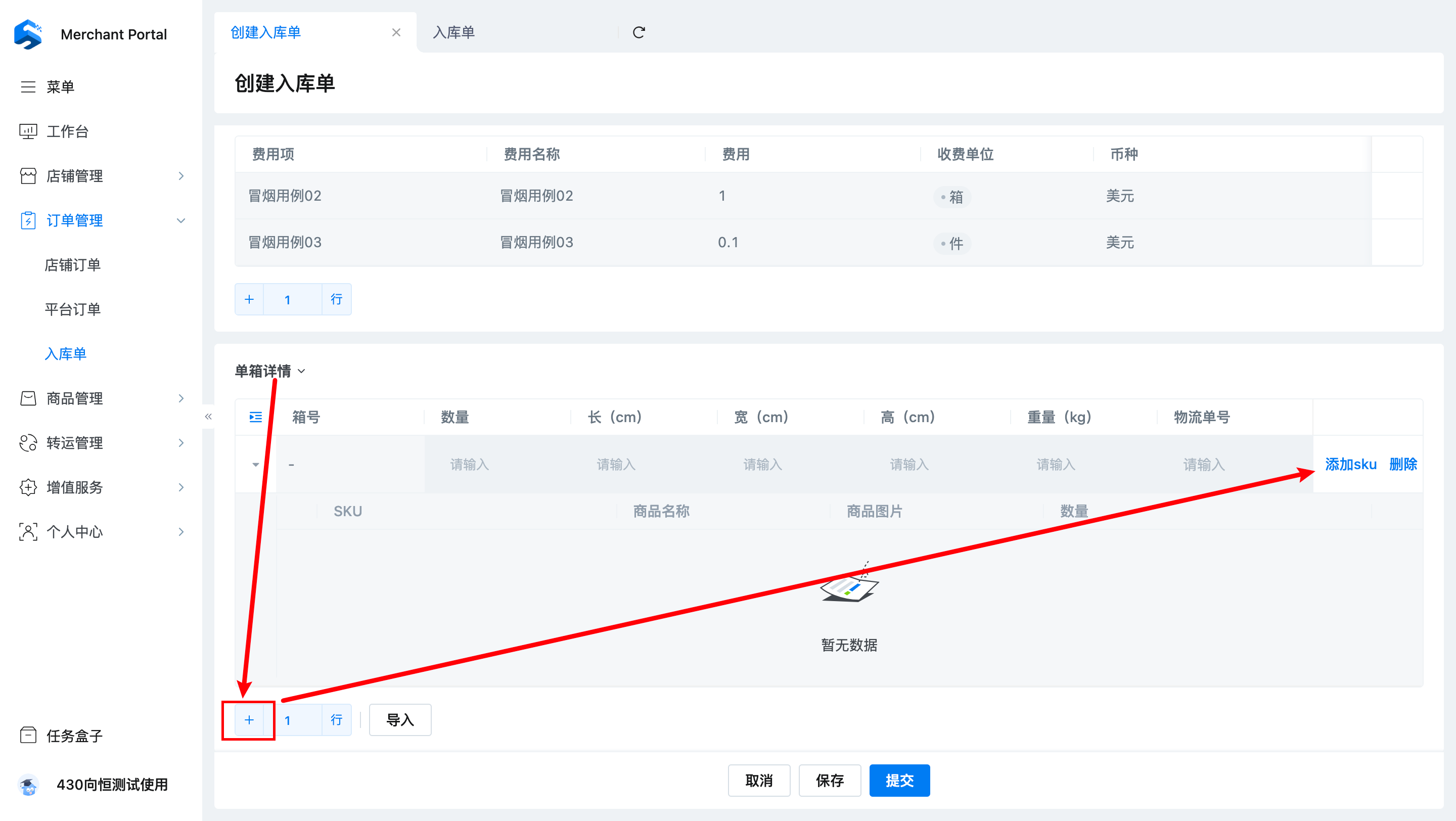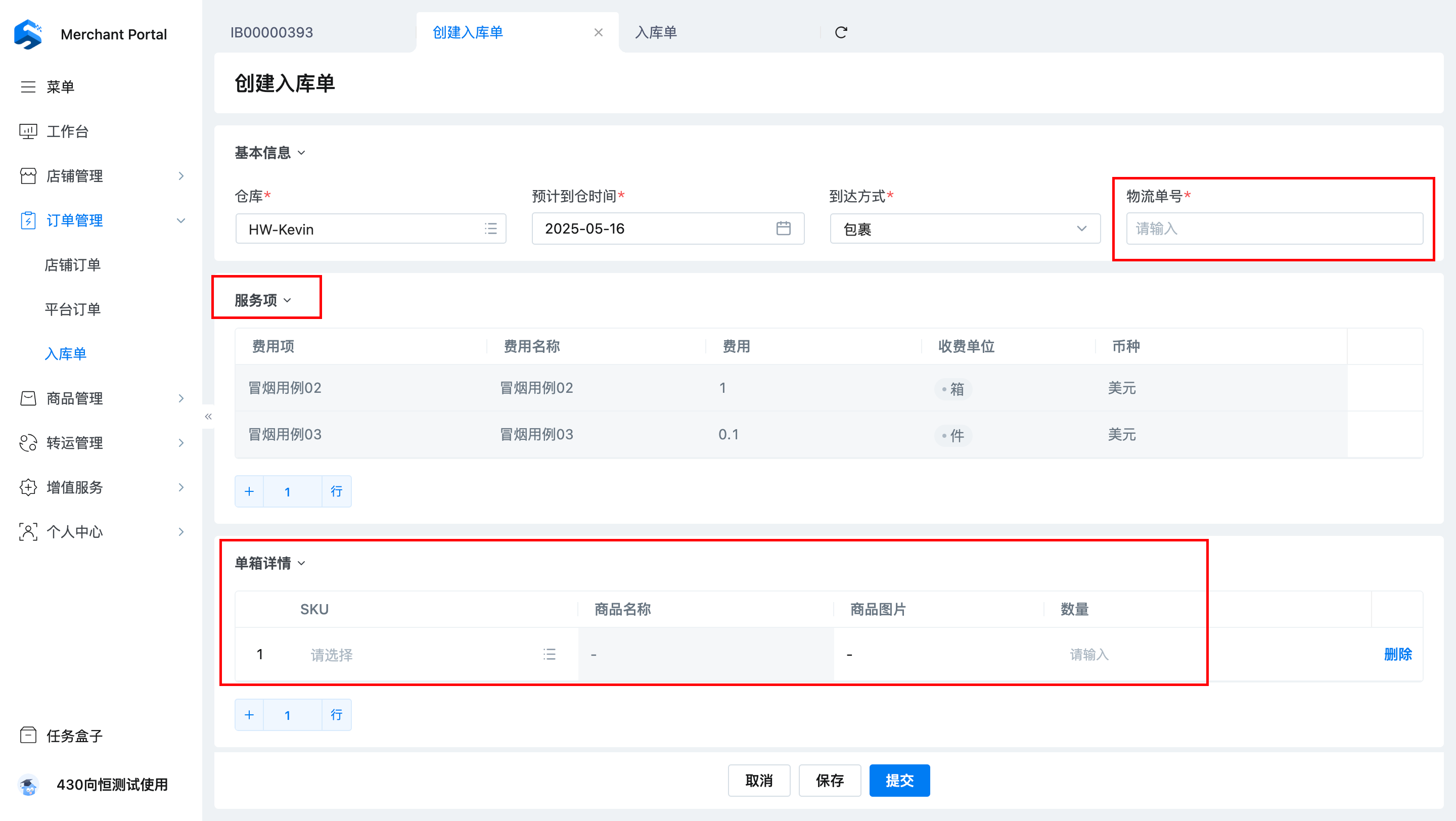 「基本信息」内必须填写「物流单号」,选择相关「费用项」并填写SKU信息、数量。
