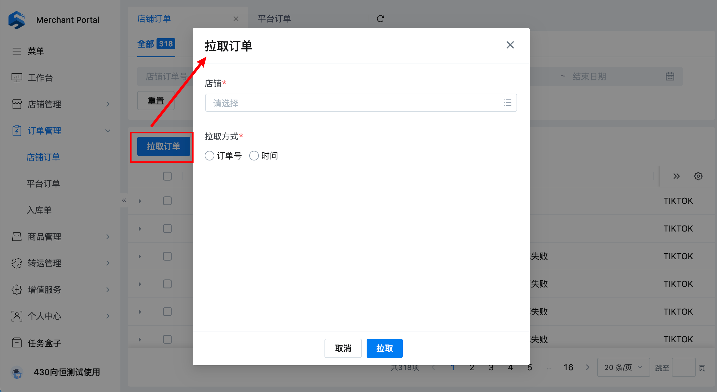 2、手动拉取:「店铺订单」--> 「拉取订单」,选择要拉取的「店铺」,可以根据「订单号」和「时间」手动拉取。