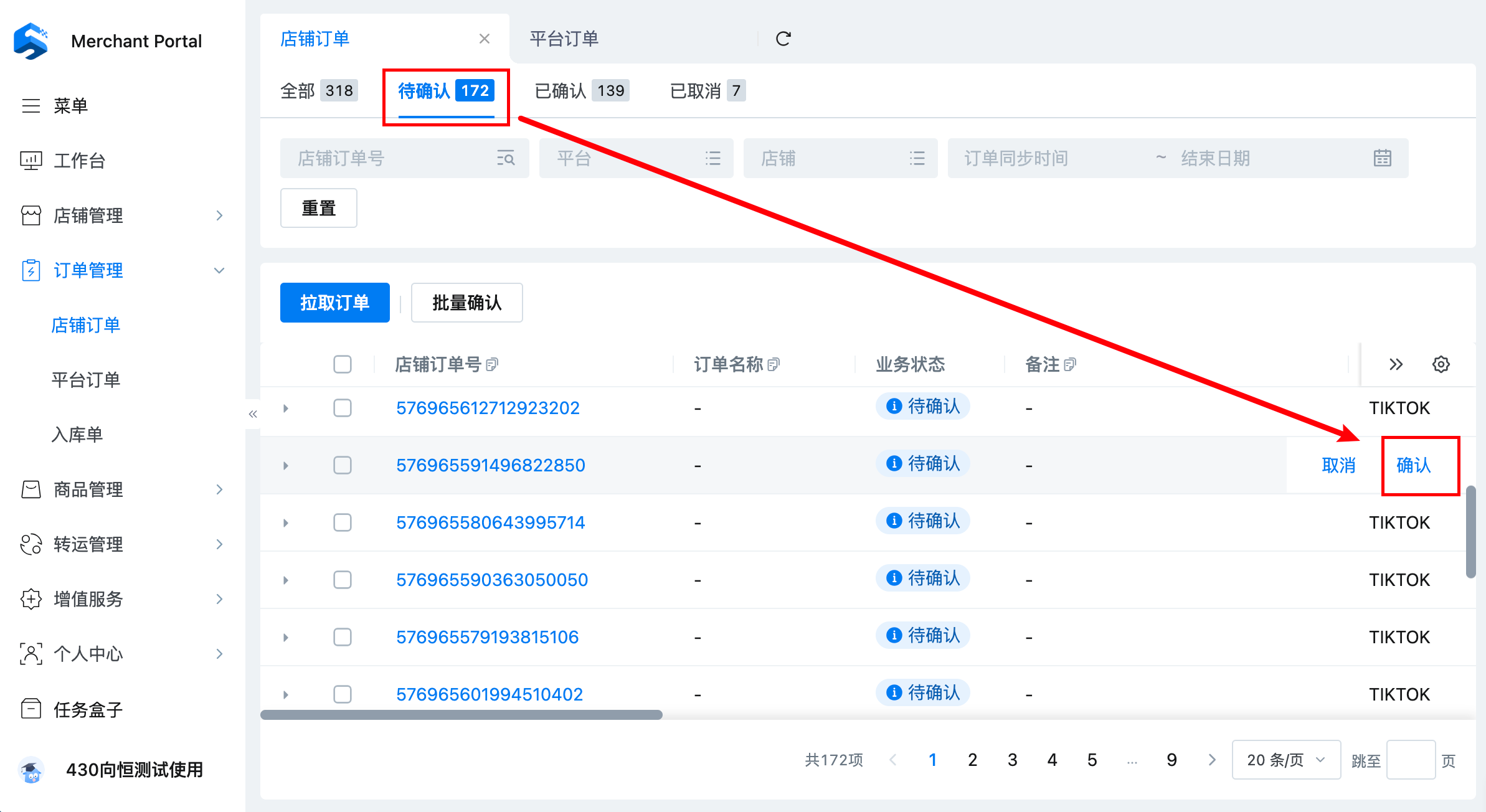 店铺订单进入系统后,默认进入「待确认」状态,点击「确认」,生成对应的待处理的「平台订单」。此处会校验店铺商品是否关联平台商品,若二者不存在关联关系,确认失败。