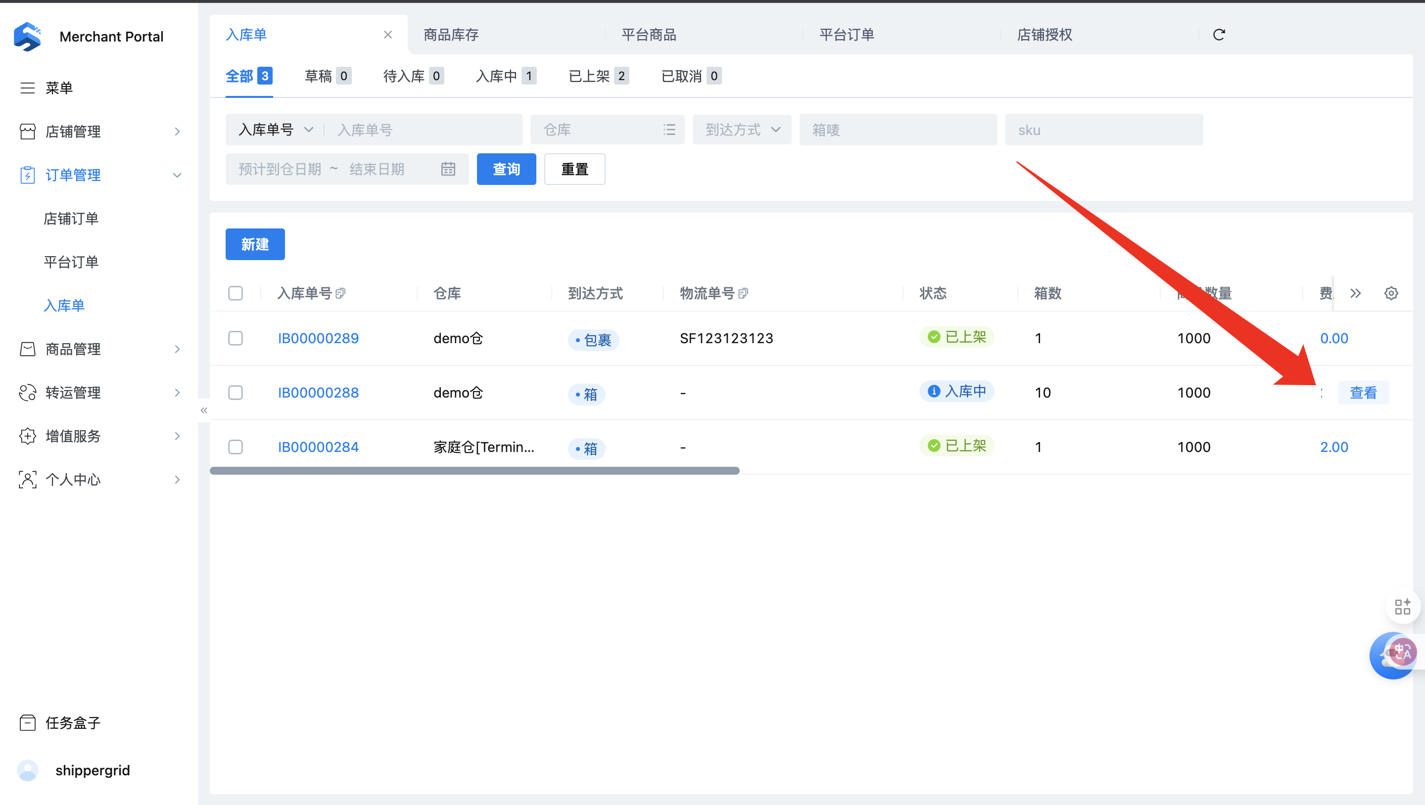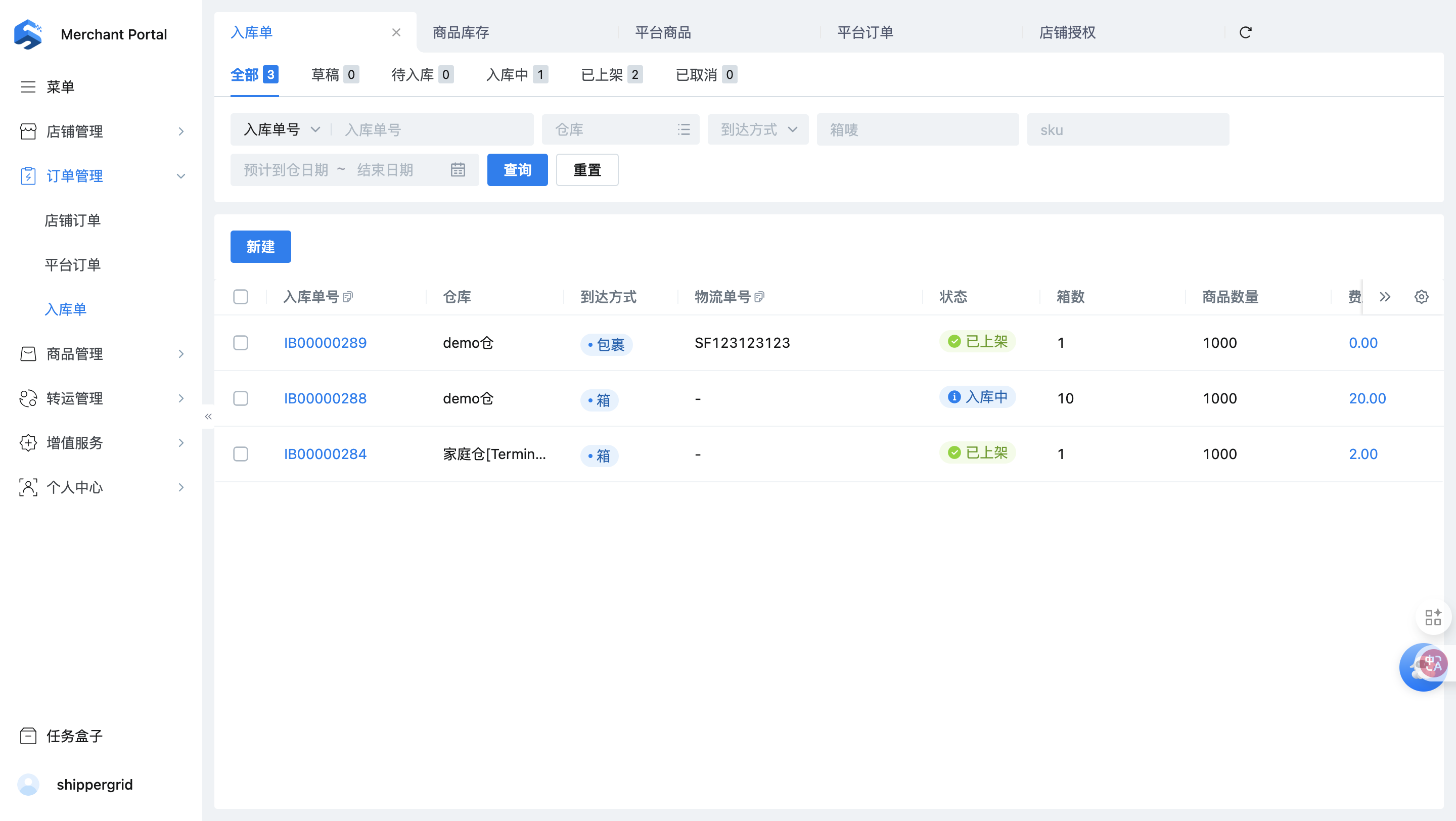 左侧菜单栏:打开「订单管理」--> 「入库单」,点击「新建」。