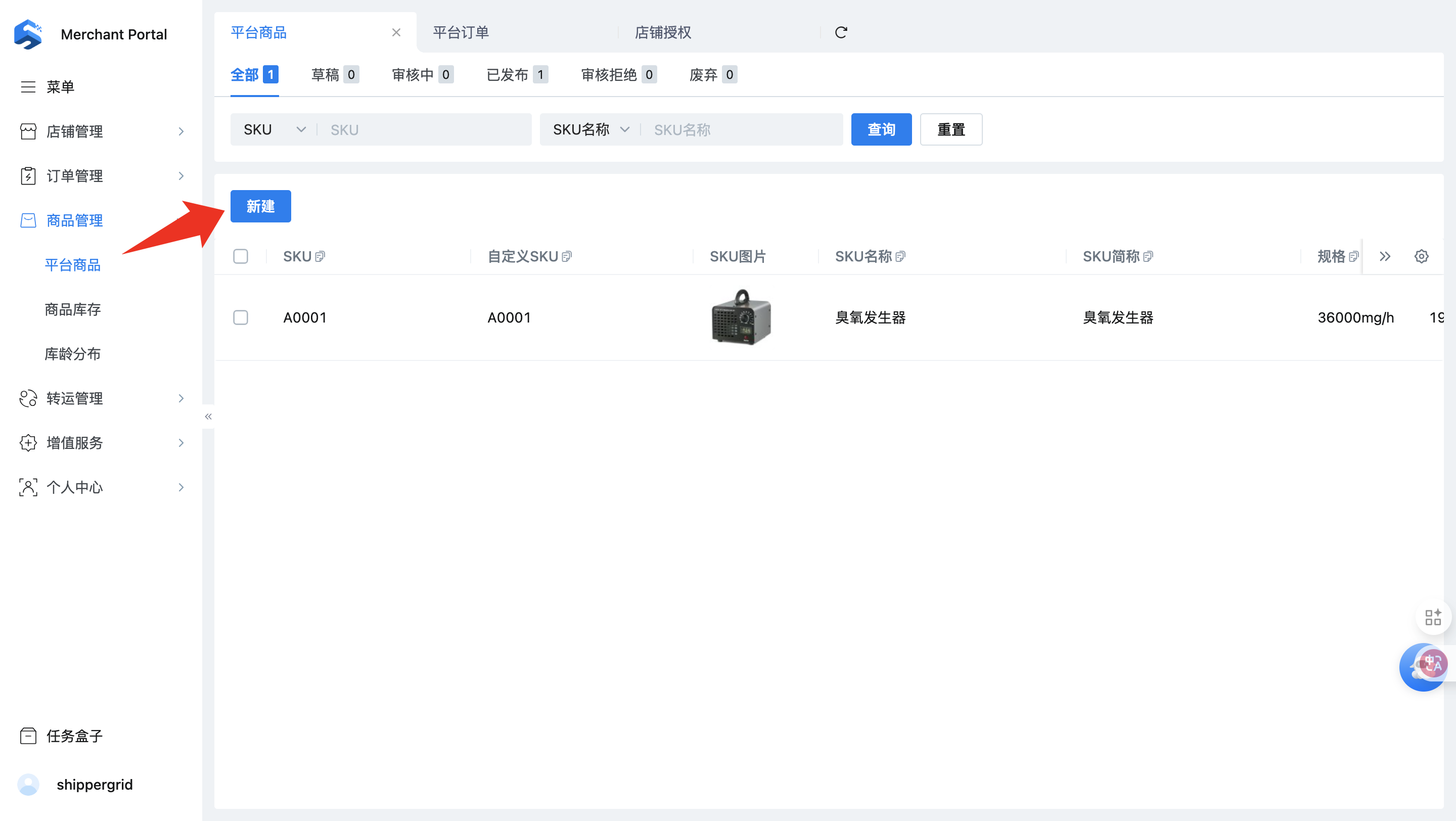 打开「商品管理」--> 「平台商品」,点击「新建」。