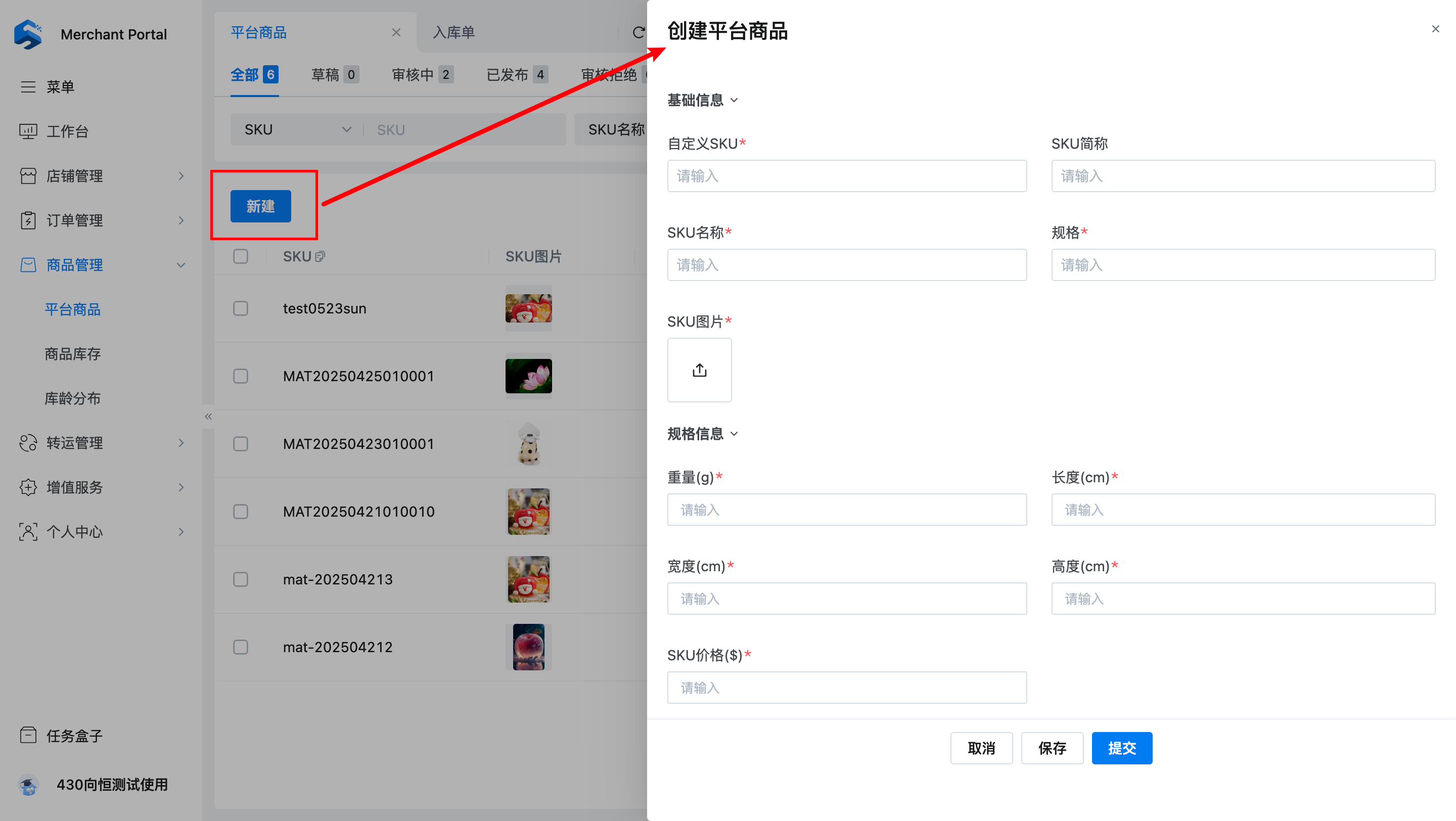 商家可以通过手工创建平台商品建立商品体系,后续会基于平台商品进行打印、出入库管理、库存管理等操作。