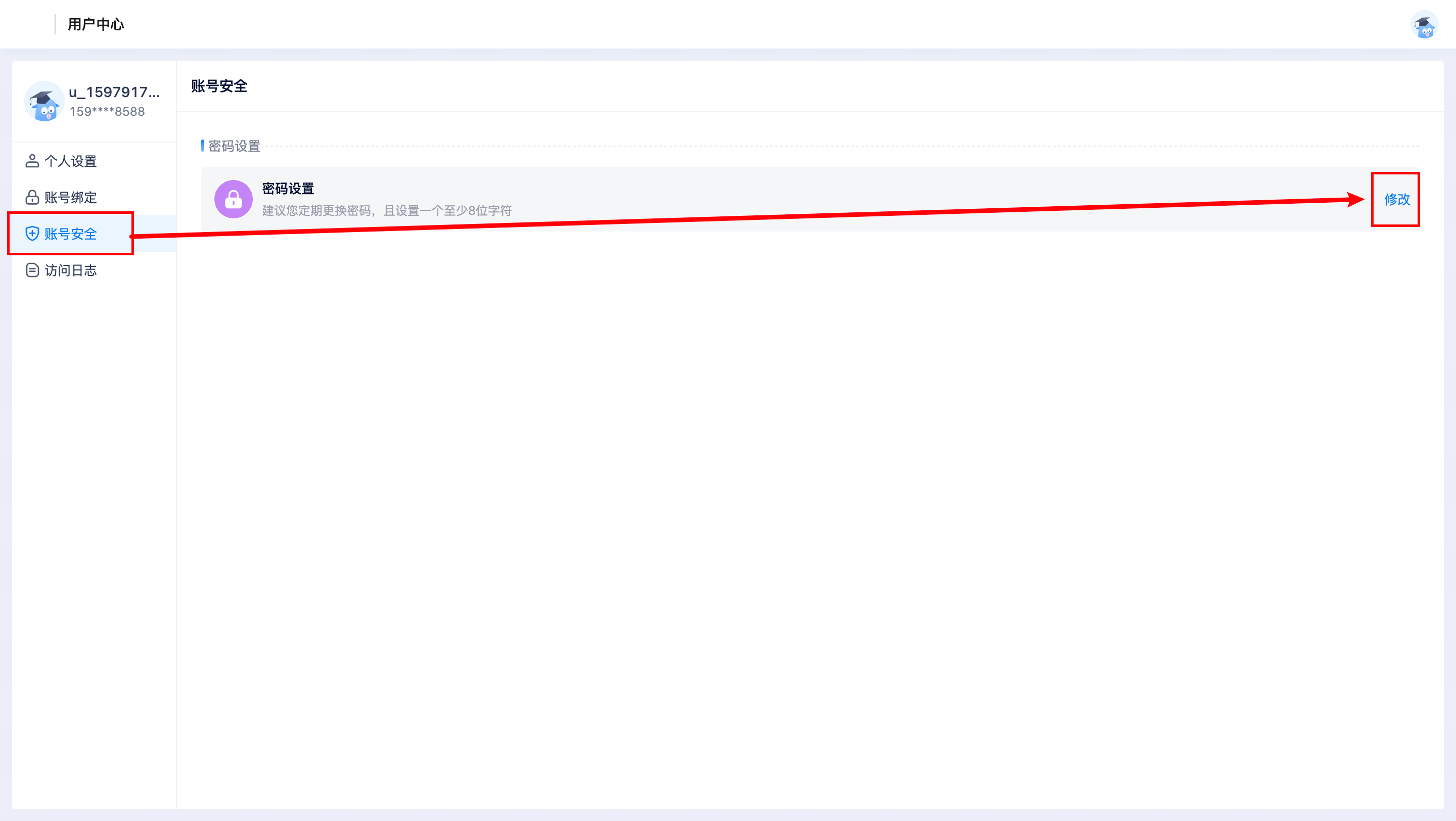 3、修改密码:点击「头像」-->「个人资料」--> 「账号安全」进行密码修改。