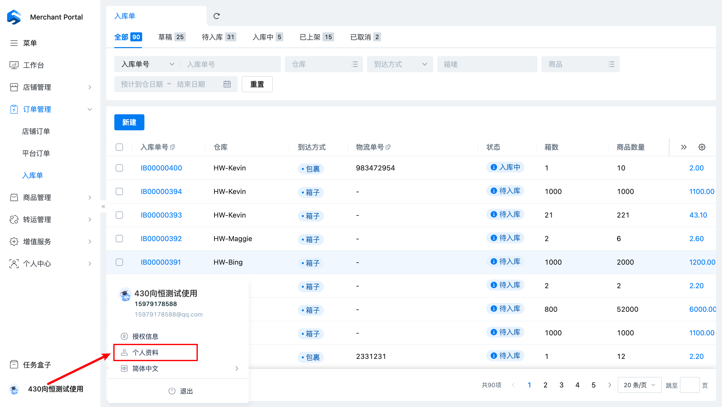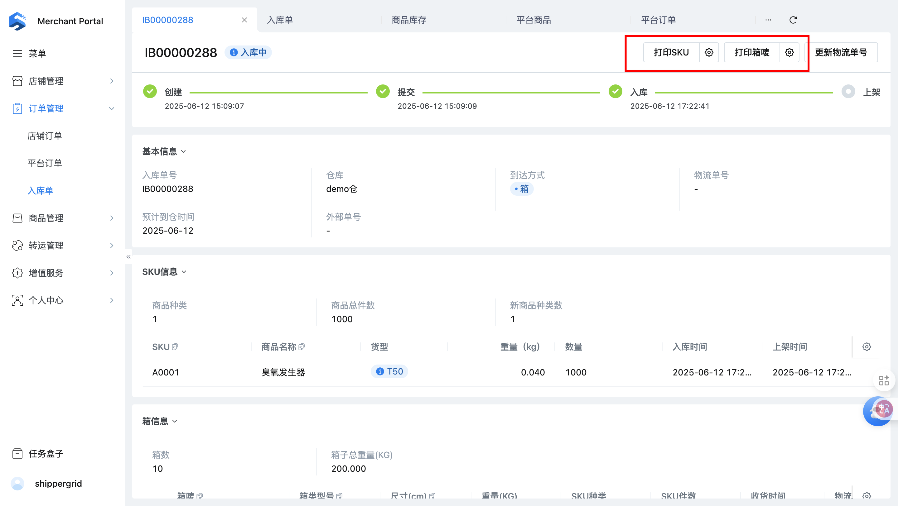 商家可在OMS端创建入库单,入库单创建完成将会推送至仓库,仓库人员收到货后可通过扫描箱唛等信息,快速签收、质检、上架。