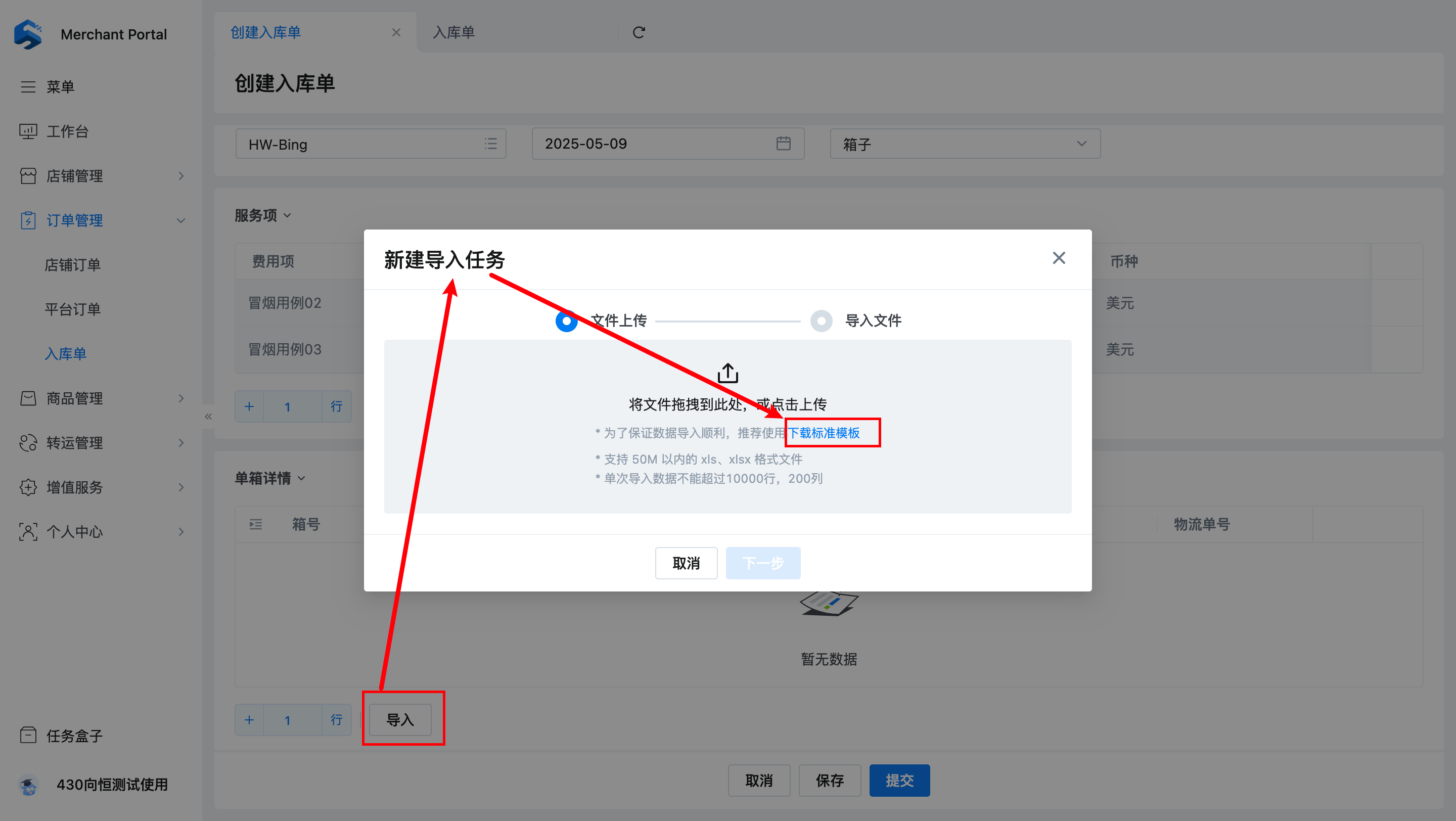 - **导入创建:**点击「导入」,在「新建导入任务」弹窗内「下载标准模板」。
