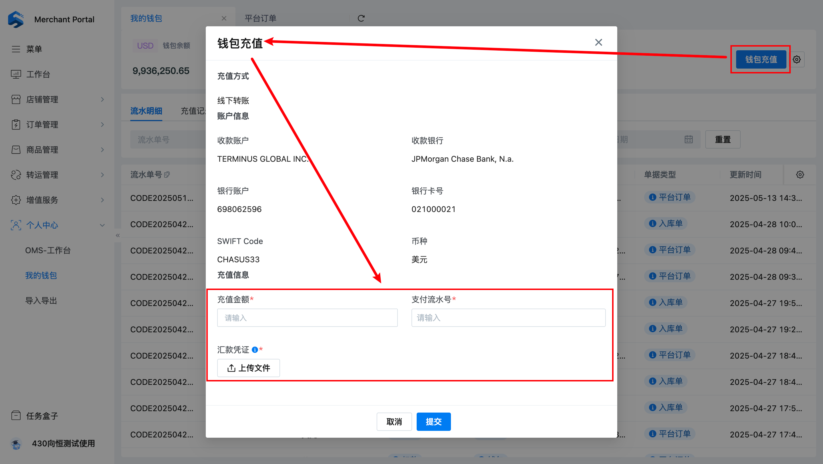 填写:「充值金额」、「支付流水号」、「汇款凭证」。