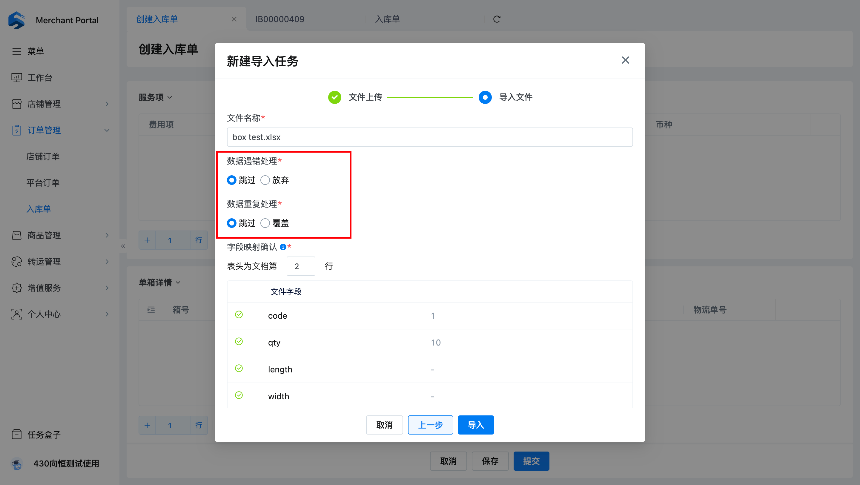 上传文件后,会出现「新建导入任务」弹窗,该弹窗内支持配置数据出错/重复后的处理方式。