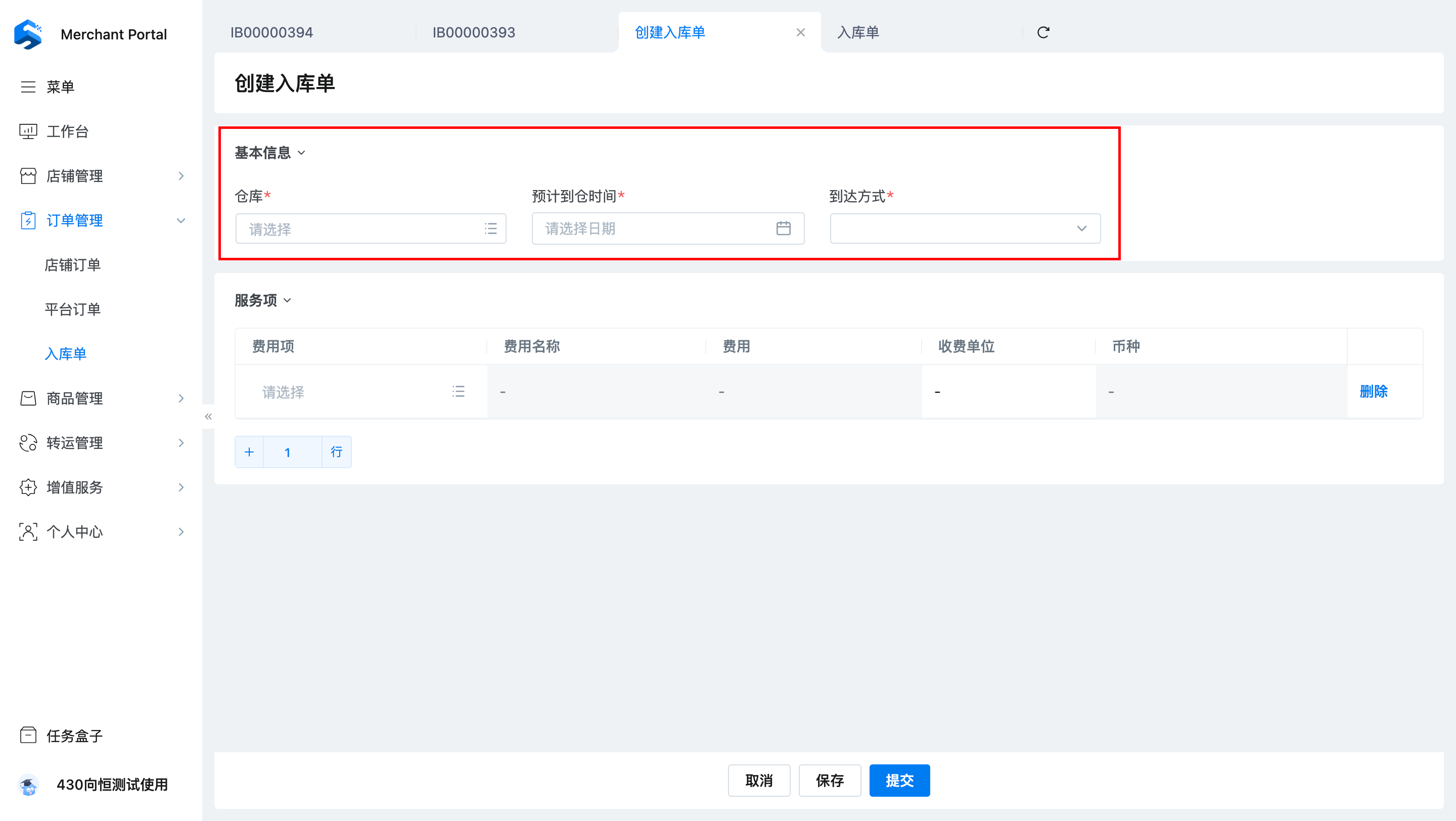 基本信息:选择「仓库」、填写「预计到仓时间」、「到达方式」。