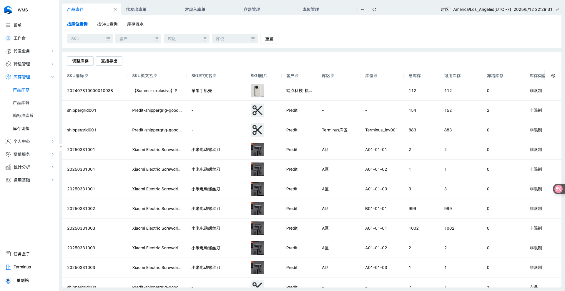 - 进入【库存管理-产品库存】,支持按照库位、SKU查询库存,也可以查看库存的流水记录