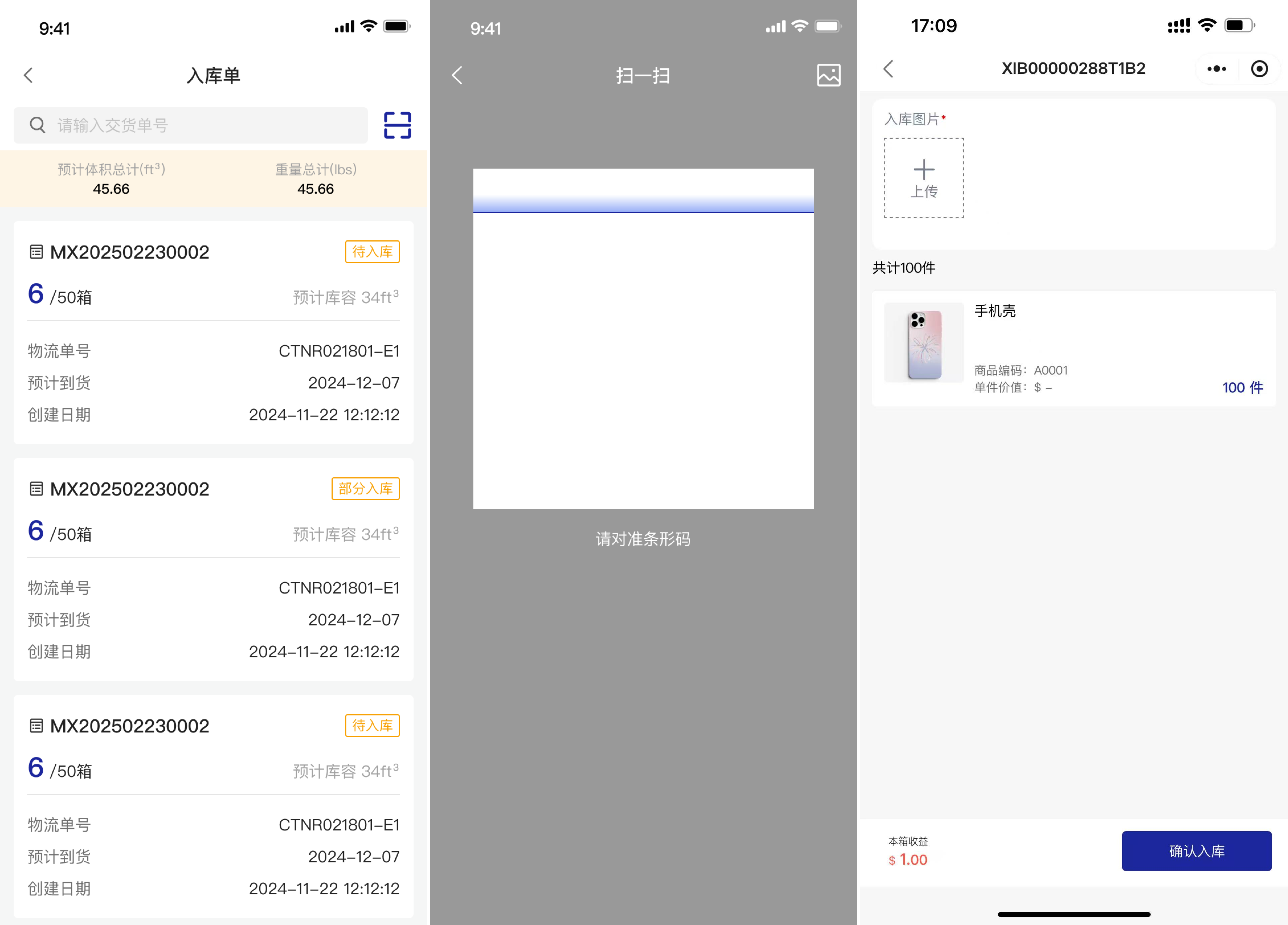 - PDA登录系统,扫描到仓的箱子或包裹上的箱唛或物流单号