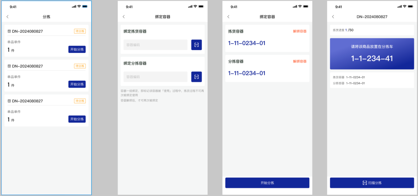 - 拣货完成后,使用PDA分拣功能进行分拣