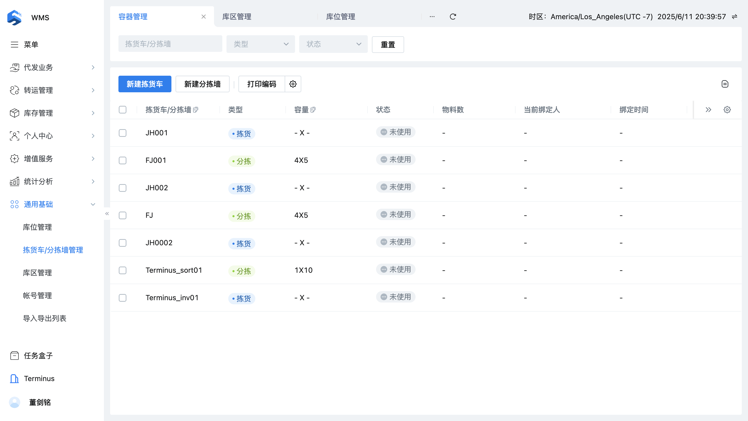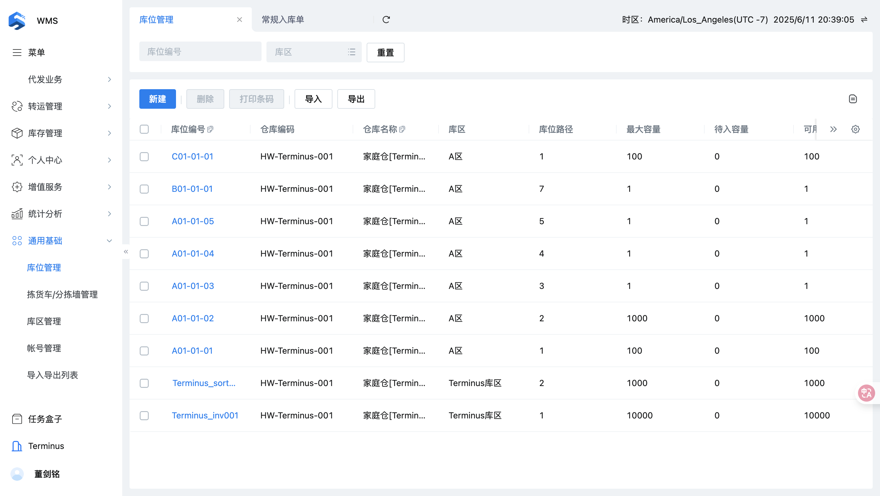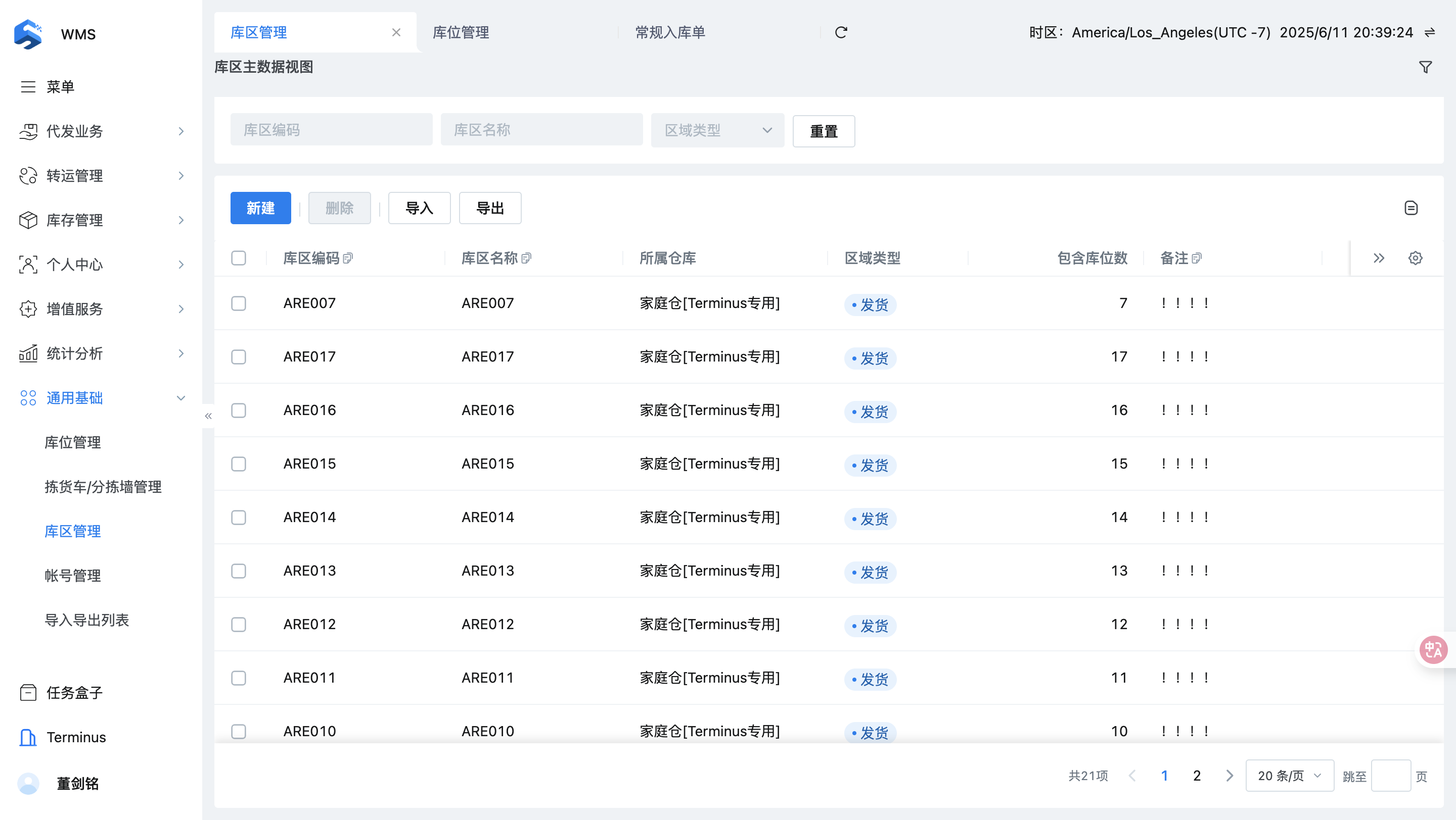 - 进入【通用基础-库区管理】、 【通用基础-库位管理】