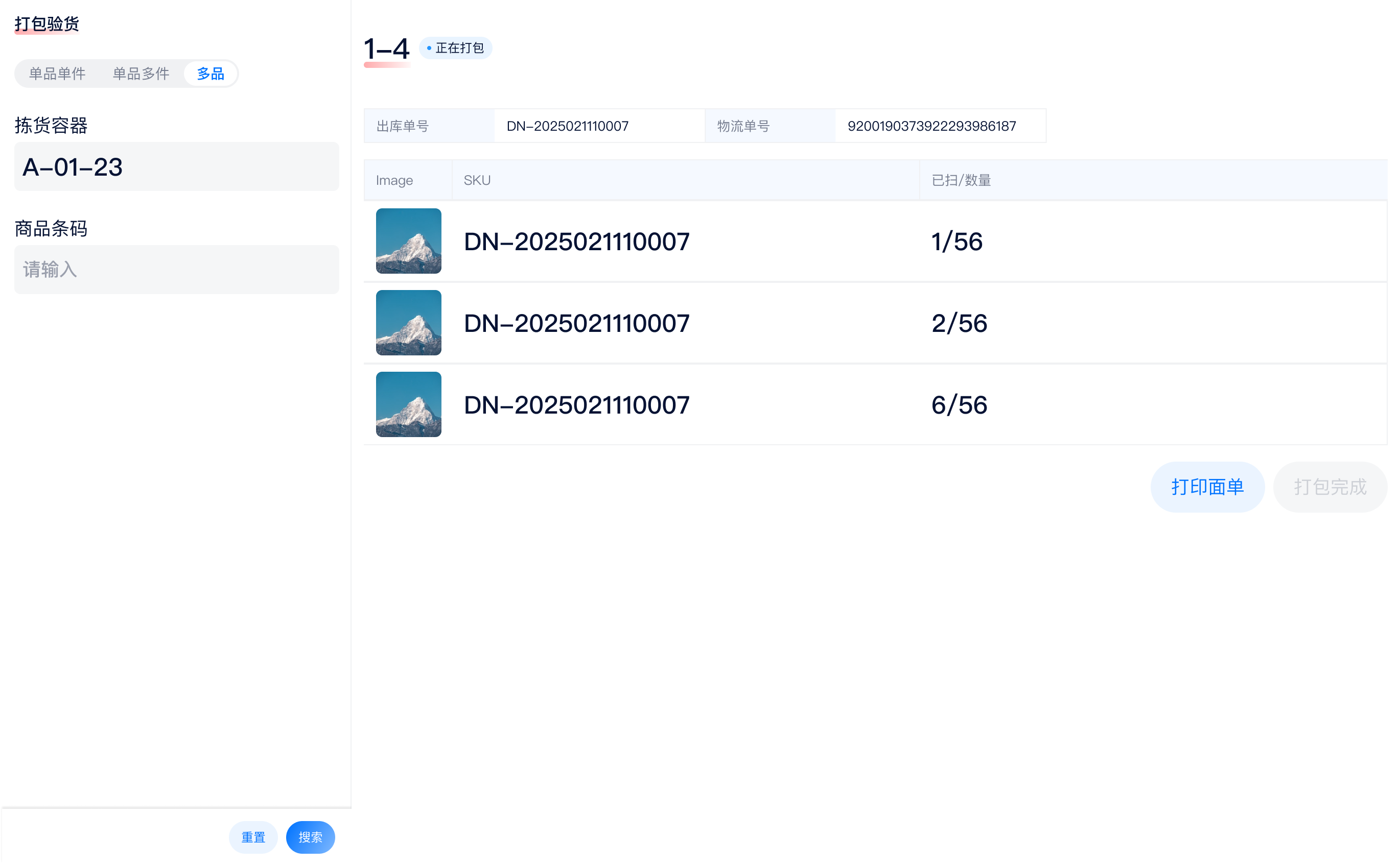 - 无需分拣或分拣完成后,可以推拣货车、分拣车在打包页面进行打包&复核商品