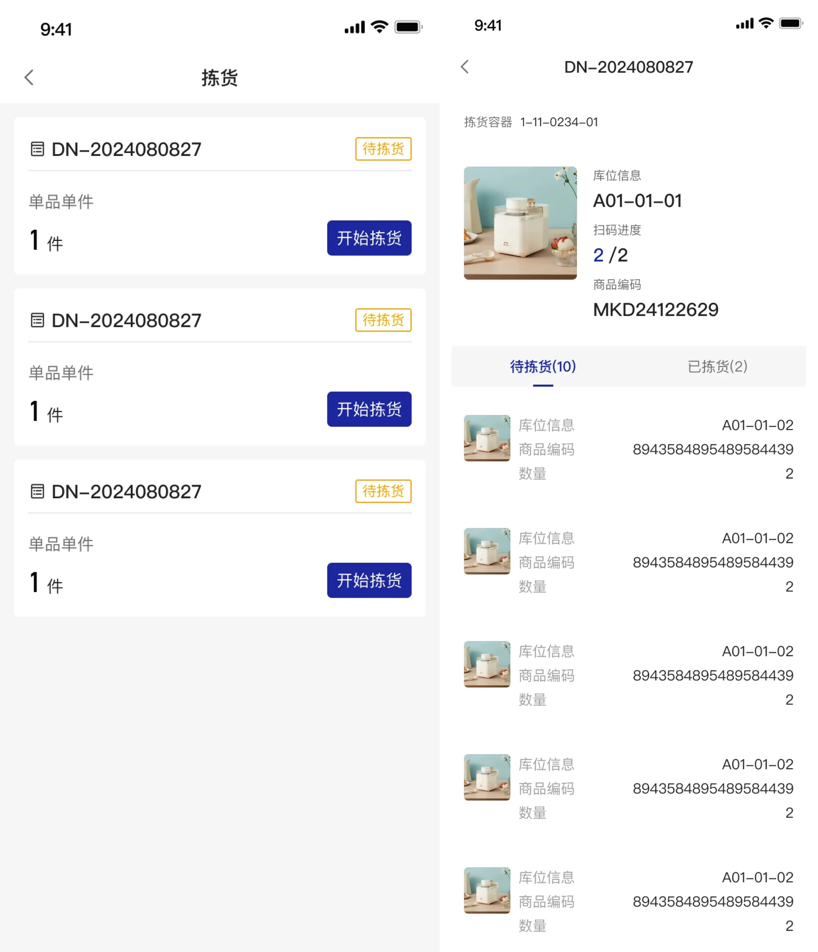 - 选择波次,绑定拣货容器(拣货车),开始拣货